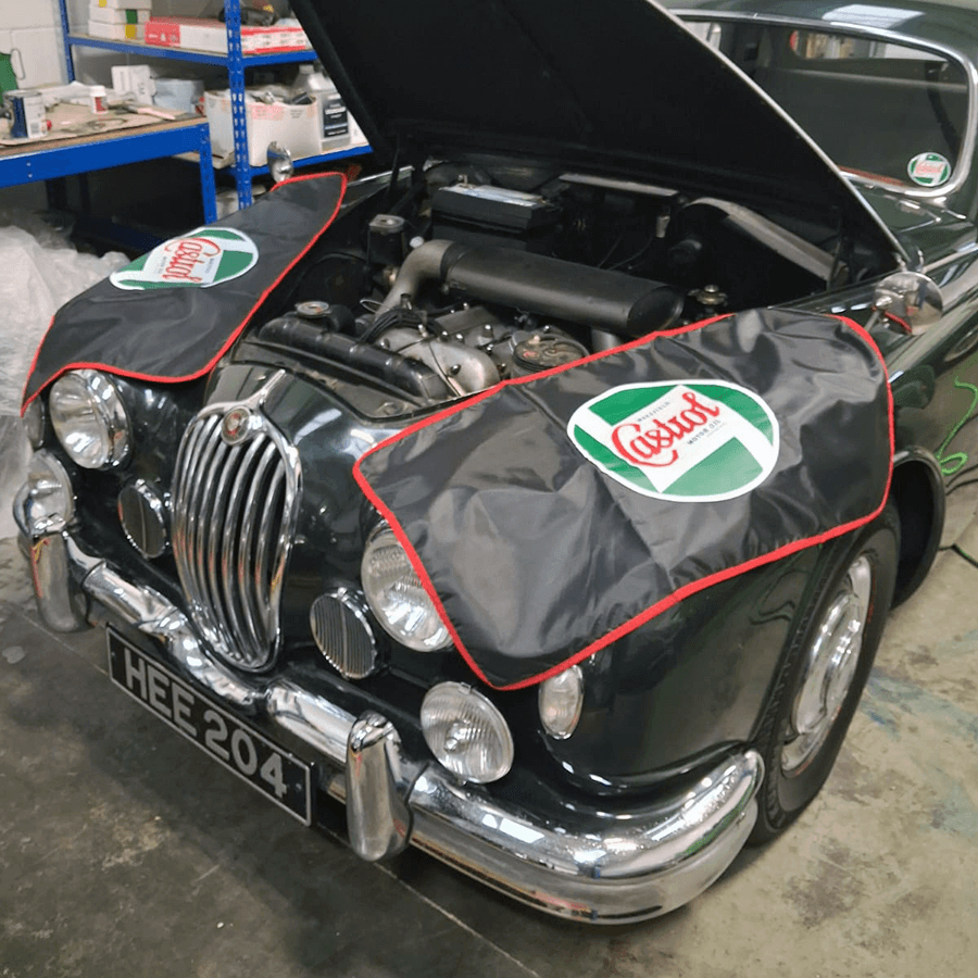 All sporting the iconic 1946 Castrol logo. The wing protectors have a non-slip backing, and the heavy duty reusable seat cover has elasticated pockets top and bottom for a secure fit. A pair of workshop gloves finishes off the pack, perfect for your next oil change!
