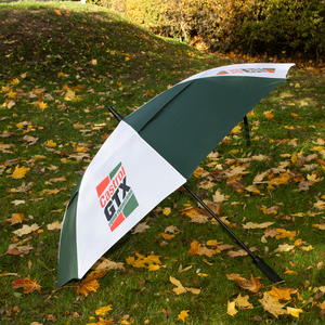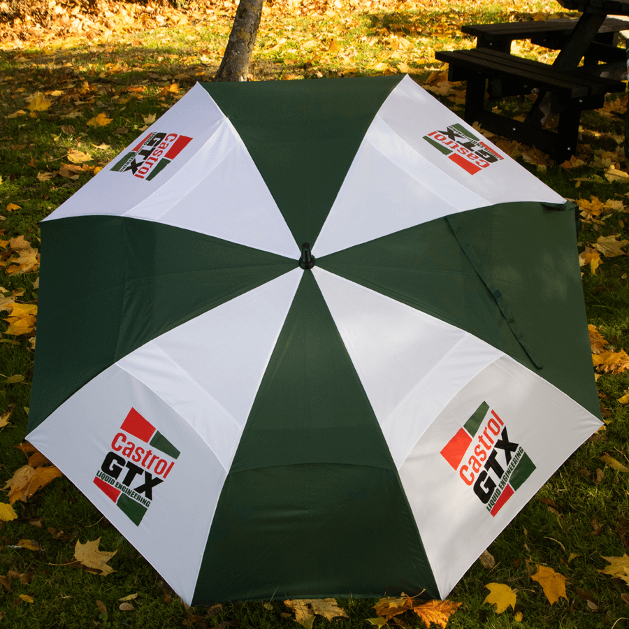 150cm golf umbrella with vented top canopy in two-tone Castrol classic green and white. Features the iconic Castrol GTX logo on 4 sides. This umbrella has a durable fibreglass frame, with push-button automatic opening and a soft grip handle. Supplied with a plain green cover sleeve.